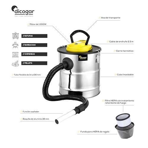 1200 W ; 20 L ; réservoir en acier inoxydable ; filtre HEPA : étui tissu pour protection filtre et prolonger la durée de vie de l’aspirateur ; fonction soufflante. Aspirateur avec aspirateur à cendres idéal pour le nettoyage des poêles à granulés, assure un environnement propre et confortable.