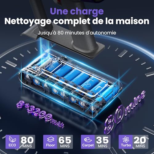Circlio Aspirateur Balai sans Fil, Aspirateur sans Fil Puissant avec Écran LED Intelligent, Brosse Anti-emmêlement, Station de Charge, pour Tapis, Sols Durs, Poils d’animaux