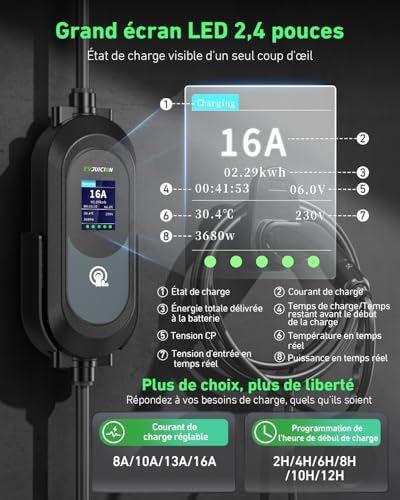 Evjuicion Chargeur Voiture Electrique [3,68KW, 8-16A, 0-12H, IP67] EV Chargeur Type 2 avec Grand écran LED et Support Mural Portabilité Cable Recharge Voiture Électrique avec Sac et Support Câble