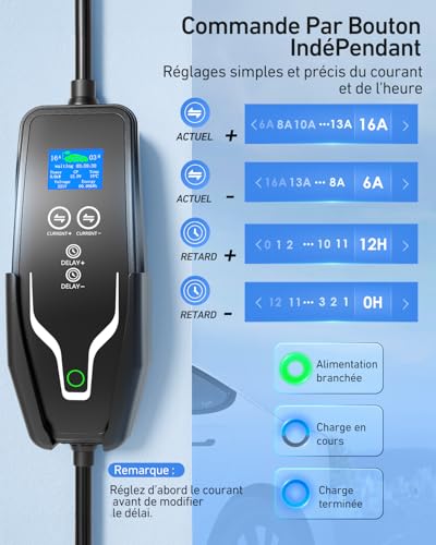 Evjuicion Chargeur Voiture Electrique Type 2 [6A-16A, 0-12H, 3,68kW] Programmé Domestique Cable Recharge Voiture électrique Portabilité avec Sac