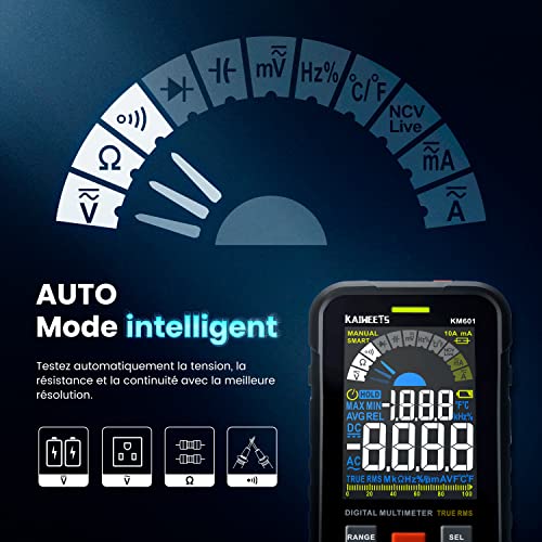 KAIWEETS Multimètre Automatique Rechargeable, Multimètre Numérique Professionnel, Testeur Electrique, Mesure de Courant Tension Résistance Continuité Capacité Diode Fréquence