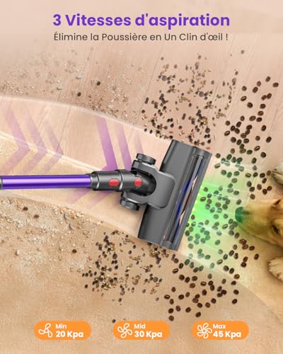 ⚡[𝐀𝐬𝐩𝐢𝐫𝐚𝐭𝐞𝐮𝐫 𝐏𝐮𝐢𝐬𝐬𝐚𝐧𝐭 𝟒𝟓 𝐤𝐏𝐚] Cet aspirateur sans fil est équipé d’un moteur sans balais de 550 W, offrant une puissante aspiration allant jusqu’à 45 kPa. Il élimine sans effort les saletés épaisses, les poils d’animaux, les peluches de tapis et la poussière dans les coins et zones difficiles d’accès. Grâce à sa structure légère, même les personnes âgées peuvent l’utiliser d’une seule main. Monter ou descendre les escaliers, nettoyer les rideaux en hauteur ou sous le canapé devient un jeu d’enfant !