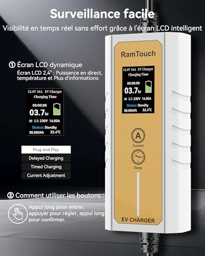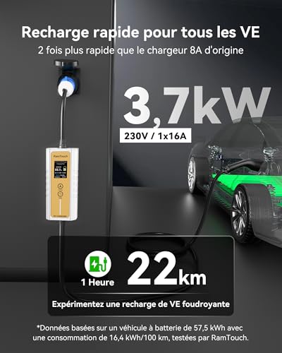 RamTouch Chargeur Voiture Électrique (3,7 KW, 6,5 m, Type 2, Schuko) – Câble Recharge avec Ampérage Réglable 6A-16A, Charge Différée et Programmée, Borne de Recharge Mobile pour EV et PHEV