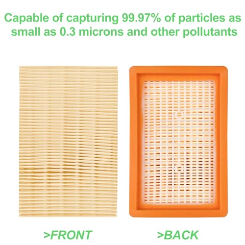 【Filtration Haute Efficacité】le Filtres Plissés Plats a une fonction de filtration puissante et peut nettoyer efficacement la saleté, les fibres de tapis et les particules de poussière dans l’air. Il peut même filtrer les particules fines telles que la poussière, les poils d’animaux et le pollen d’une taille minimale de 40 μm (= 0,04 mm).